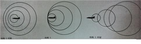 시속 1200km 이하인 마하 1 이하의 속도에서는 비행기의 앞 뒤쪽에 있는 압력파는 절대로 비행기에 따라 잡히는 일이 없다. 그러나 마하 1에서는 압력파와 기체가 똑 같은 속도로 전진한다. 그러다 마하 1 이상, 즉 음속을 넘으면 압력파는 뒤로 밀려나고 만다. 이때 기체는 원추형 모양의 연속파를 뒤쪽으로 밀어내고 앞서 날아가게 되는 것이다.