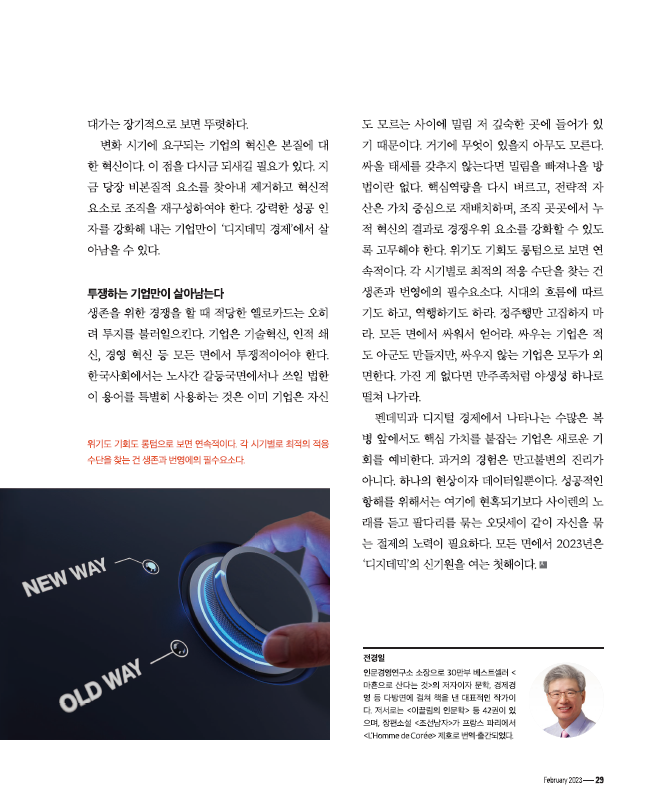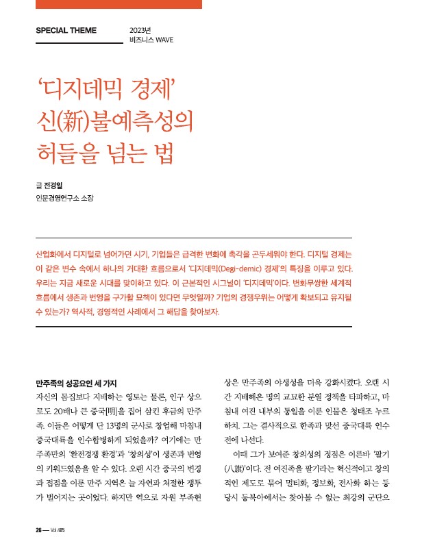 칼럼|사보기고 '디지데믹경제'의 허들을 넘는 법 by 전경일 2023. 2. 6. 공유하기 게시글 관리 인문경영연구소 저작자표시 (새창열림) 관련글 창조적 활동으로 통섭형 혁신을 이끌라 지도자와 참모가 함께 성공하기 위한 조건 <조선남자> 웹툰화 작업 시작 <조선남자1> 불어판(佛語 版) 파리에서 출간(L'Homme de Corée )