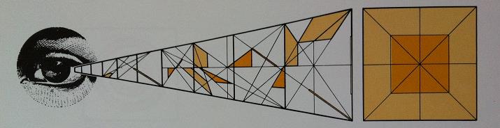 예를 들어 위 그림의 오른쪽에 색칠한 카드가 배치되어 있는 것을 볼 때 우리는 평면적으로 피라밋상을 연상한다. 하지만 이 모양은 실은 왼쪽의 수많은 조각들의 입체적 모임이거나, 공간을 통해 눈에 투영되는 각도 때문에 그것들이 하나의 질서정연한 패턴으로 보이는 것이다. 왼쪽의 조각들만 봐서는 오른쪽의 피라미드가 생길 것으로 예견하기는 쉽지 않다.
