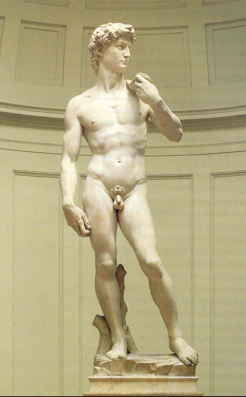 이 유명한 다비드 상을 만드는데 쓰인 대리석은 처음에는 1464년에 아고스티노 디 두치오라는 조각가에게 맡겨진 것이었다. 8년 뒤에는 안토니오 로셀리노에게로 넘어간다. 그러다 마침내 미켈란젤로의 손에까지 건너온다. 엉성하게 잘리고 작업되다 만 원석으로 미켈란젤로는 전혀 다른 작품을 창조해 냈다. 이 작품이 완성되었을 때, 사람들은 노골적인 부위는 고사하고, 양손과 머리의 크기도 엄청나서 “모든 면에서 다윗이 아니다”라고 말할 정도였다. 다비드상은 처음에는 독립된 작품으로 제작된 것이 아니라 피렌체 성당 지붕 위에 세워두기로 한 것이다. 머리 크기와 돌을 던지려는 두 팔이 강조된 이유가 여기에 있다. 하지만 워낙 아름다워 전체를 볼 수 있는 곳에 두기로 했다. 종합적으로 이 작품이 지닌 함의를 살펴보면 미켈란젤로가 다비드 상을 만든 이유를 알아차릴 수 있다. 이 조각가는 과감한 정신으로 양치기 소년 다윗이 가졌던 용기를 끌어냄으로써 피렌체의 자부심을 드러냈다. 이 완벽한 작품은 육체는 영혼의 거울이라는 그의 신념이 반영된 것이다. 이 작품은 보이지 않는 것을 보게 하는 힘의 원천이 뭔지를 일깨워 준다. 1504년, 높이 5.17m, 대리석, 피렌체, 바르젤로 미술관 소장.