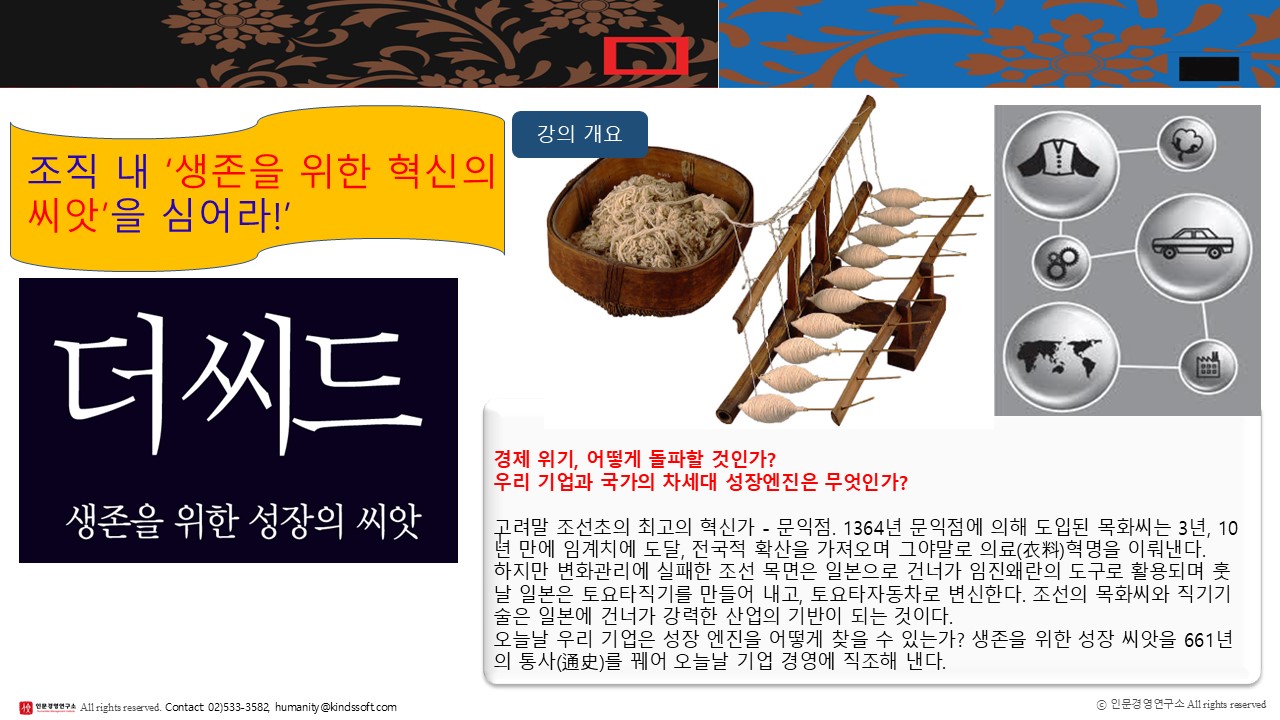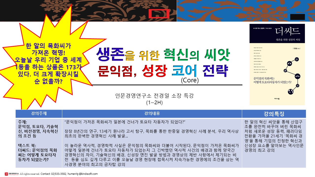 강의 | 교육 프로그램 안내 생존을 위한 혁신의 씨앗 문익점, 성장 코어 전략(강의안내) by 전경일 2025. 2. 18. 공유하기 게시글 관리 인문경영연구소 저작자표시 비영리 동일조건 (새창열림) 관련글 <조선화가의 삶과 그림>을 주제로 강의했습니다. 15인의 천재화가의 삶과 그림을 통해, 예술혼을 알아 보았습니다. 야생에서 살아남는 누르하치의 경영전략 경제위기시대 이순신 필사의 승리전략(강의안내) 대한민국 최고경영자들이 함께 하는 ‘세계 최정상에서의 경영자회' "Aim High CEO Conference”
