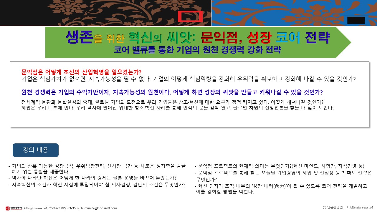강의 | 교육 프로그램 안내 생존을 위한 혁신의 씨앗 문익점, 성장 코어 전략(강의안내) by 전경일 2025. 2. 18. 공유하기 게시글 관리 인문경영연구소 저작자표시 비영리 동일조건 (새창열림) 관련글 <조선화가의 삶과 그림>을 주제로 강의했습니다. 15인의 천재화가의 삶과 그림을 통해, 예술혼을 알아 보았습니다. 야생에서 살아남는 누르하치의 경영전략 경제위기시대 이순신 필사의 승리전략(강의안내) 대한민국 최고경영자들이 함께 하는 ‘세계 최정상에서의 경영자회' "Aim High CEO Conference”