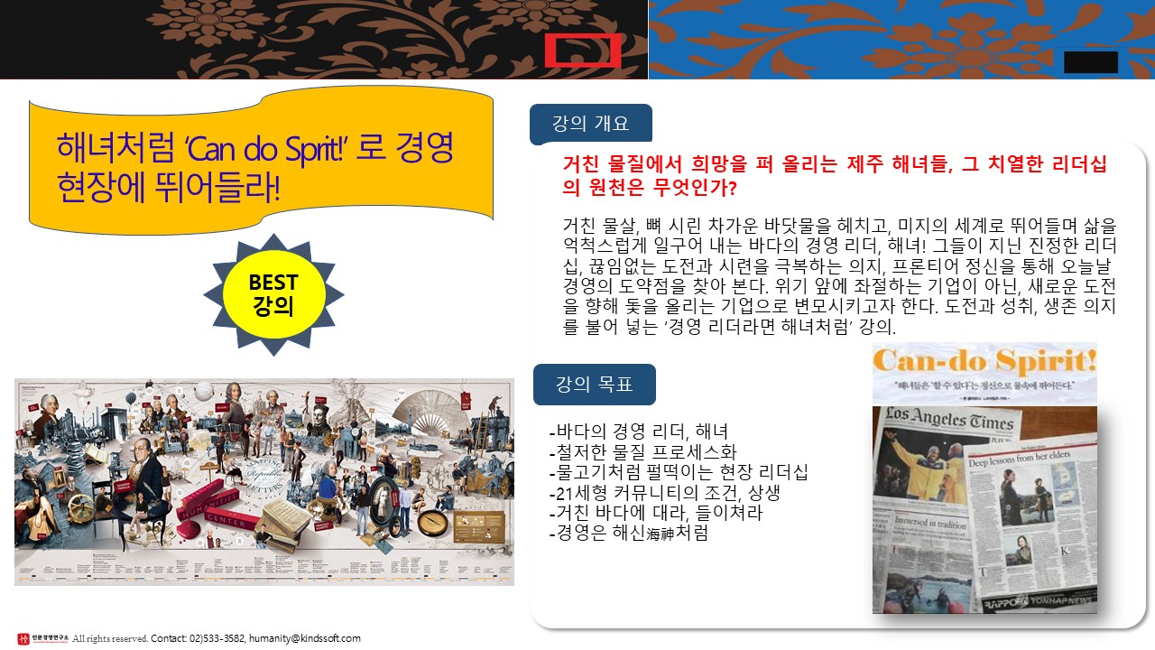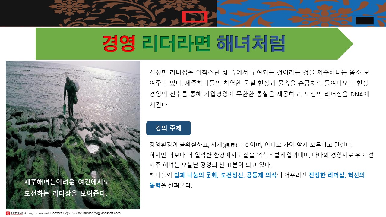 거친 물살을 헤치고, 삶을 개척하는 해녀들의 강인함, 근면, 혁신 마인드, 도전의식을 통해 우리 내부의 힘을 어떻게 경영전반에 확산시키고, 안착할 수 있는지 우리는 이제 귀 기울여야 한다.