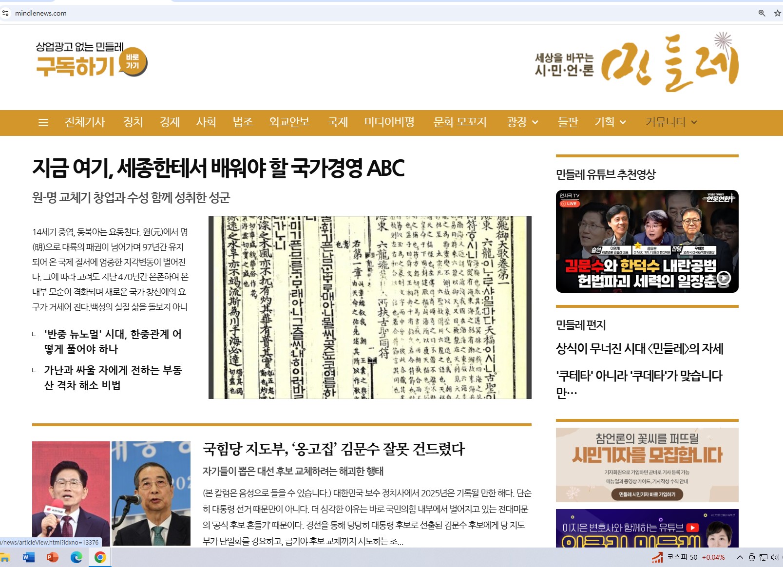 북리뷰|뉴스|기사|강의후기 지금 여기, 세종한테서 배워야 할 국가경영 ABC by 전경일 2025. 5. 9. https://www.mindlenews.com/news/articleView.html?idxno=13376 지금 여기, 세종한테서 배워야 할 국가경영 ABC - 세상을 바꾸는 시민언론 민들레 14세기 중엽, 동북아는 요동친다. 원(元)에서 명(明)으로 대륙의 패권이 넘어가며 97년간 유지되어 온 국제 질서에 엄중한 지각변동이 벌어진다. 그에 따라 고려도 지난 470년간 온존하여 온 내부 www.mindlenews.com 공유하기 게시글 관리 인문경영연구소 저작자표시 비영리 동일조건 (새창열림) 관련글 세종, 위대한 국가는 어떻게 탄생하는가? 통치사의 대강은 <통감(通鑑)>에 있다 2025년 가울학기 울산대 테크노 CEO 과정 <세상을 이끄는 Good to Great인문경영 인사이트> '시골 부모'가 전하는 삶의 이야기, 나의 부모를 떠올리게 한다