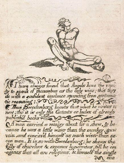블레이크는 어릴 때부터 비상한 환상력을 지녀 신비로운 체험을 표현하고, 자연과 인간의 세계의 순수한 사랑과 아름다움, 인간의 근원에 있는 문제에 집중했다. 신화적 상징을 통해 원초적 체험을 표현하기도 한 그의 예술 세계는 당대는 물론 사후에도 몇몇 사람들을 제외하고는 오랫동안 이해되지 않다가 20세기에 들어서야 마침내 새롭게 평가받게 된다. 블레이크의 무한과 이어지는 영적 세계는 스티브 잡스의 정신세계에 지대한 영향을 미쳤다. 그림은 〈천국과 지옥의 결혼〉에 들어간 삽화.