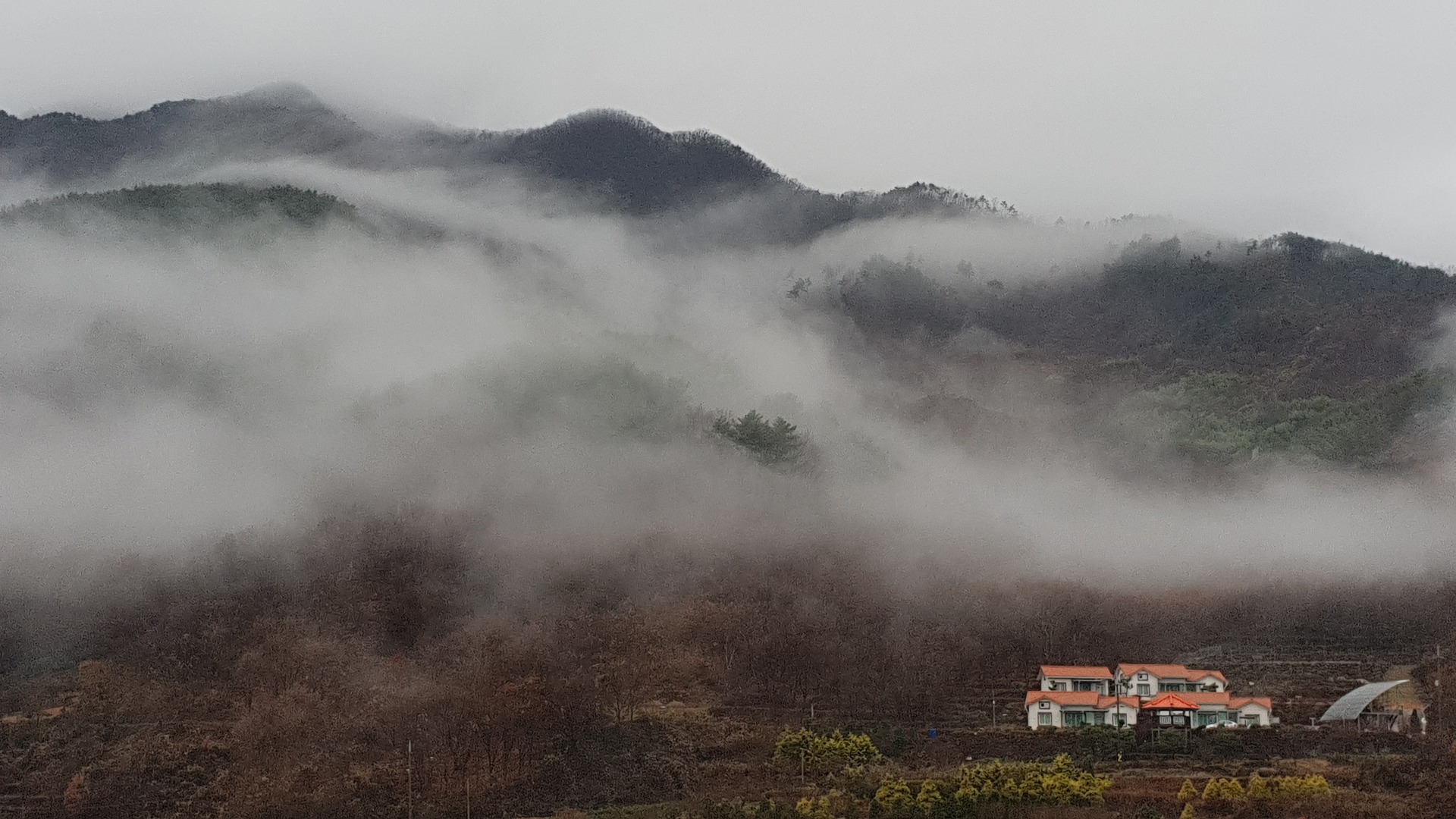 운무는 산 허리를 감싸고