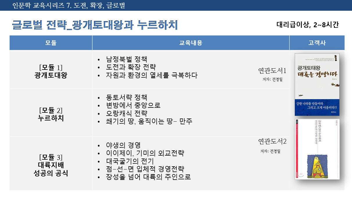 강의 | 교육 프로그램 안내 [글로벌/확장] 광개토대왕과 누르하치 by 전경일 2023. 3. 23. 인문학 교육시리즈 7. 도전, 확장, 글로벌 [글로벌전략_광개도대왕과 누르하치] 프로그램입니다. 강의문의: humanity@kindssoft.com 공유하기 게시글 관리 인문경영연구소 저작자표시 (새창열림) 관련글 [베스트강의] 세종리더십과 창조경영 교육프로그램 [베스트강의] 이순신, 사즉필생의 리더십 [베스트강의] 문익점과 도요타자동차 [인문학/예술] 조선화가의 삶과 그림