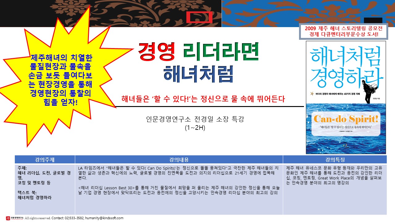 경영 리더라면 해녀처럼(2016년 제주해녀 유네스코 등재에 영향을 미친 바로 그 책 & 강의)
